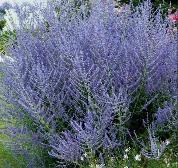 Перовския лебедолистная (Perovskia atriplicifolia), также известная как русский шалфей, принадлежит к семейству Яснотковых. Это растение представляет собой высокий, раскидистый куст, который с июля по октябрь украшен сине-фиолетовыми цветами, собранными в метёлки. Внешне перовския напоминает лаванду, но значительно крупнее. Длительное цветение, зимостойкость и внушительная высота делают русский шалфей популярным среди садоводов и ландшафтных дизайнеров.