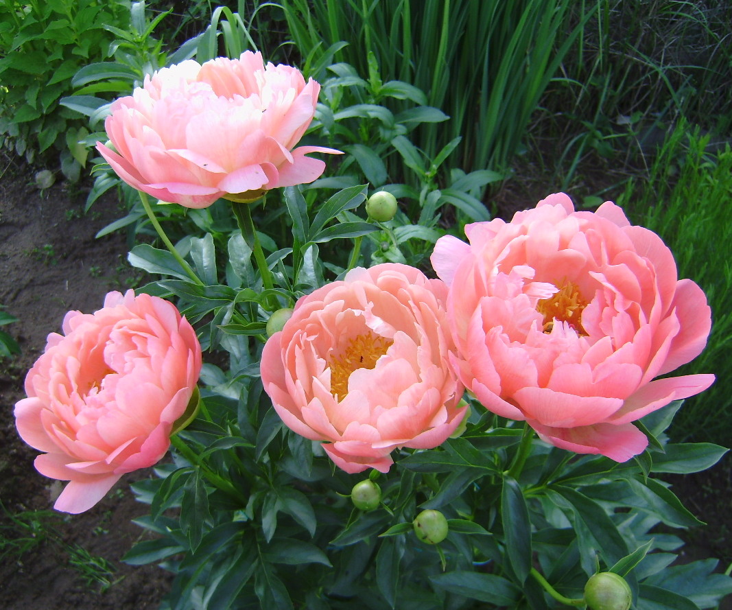 3. Посадка: Саженцы пиона Coral Charme высаживают на глубину около 5-7 см, оставляя расстояние между растениями около 60-80 см.